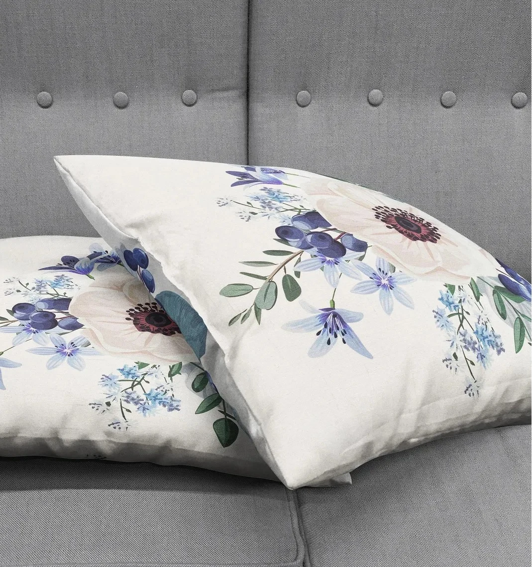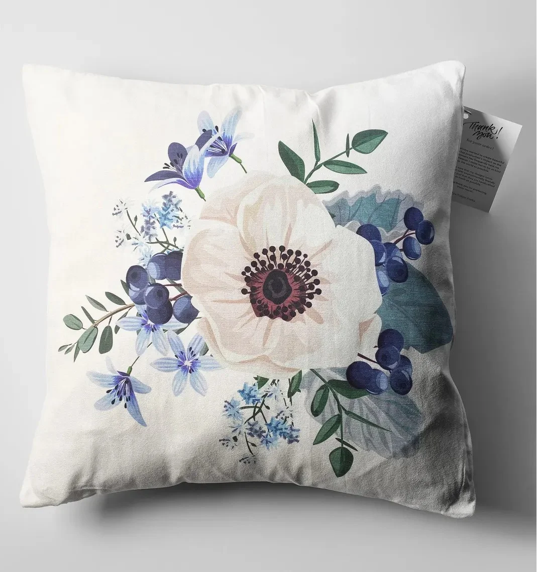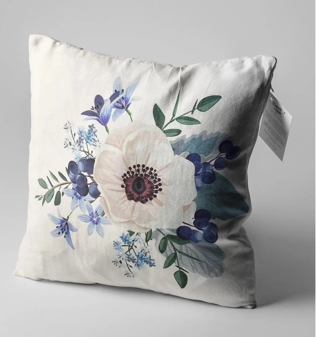 Description: Add a touch of soft elegance to your space with this beautiful throw pillow cover. The design features a delicate floral bouquet with a prominent white anemone flower at its center, accented by small blue blossoms, deep indigo berries, and muted green leaves. This romantic and gentle motif is perfect for decorating a sofa, bed, or armchair.