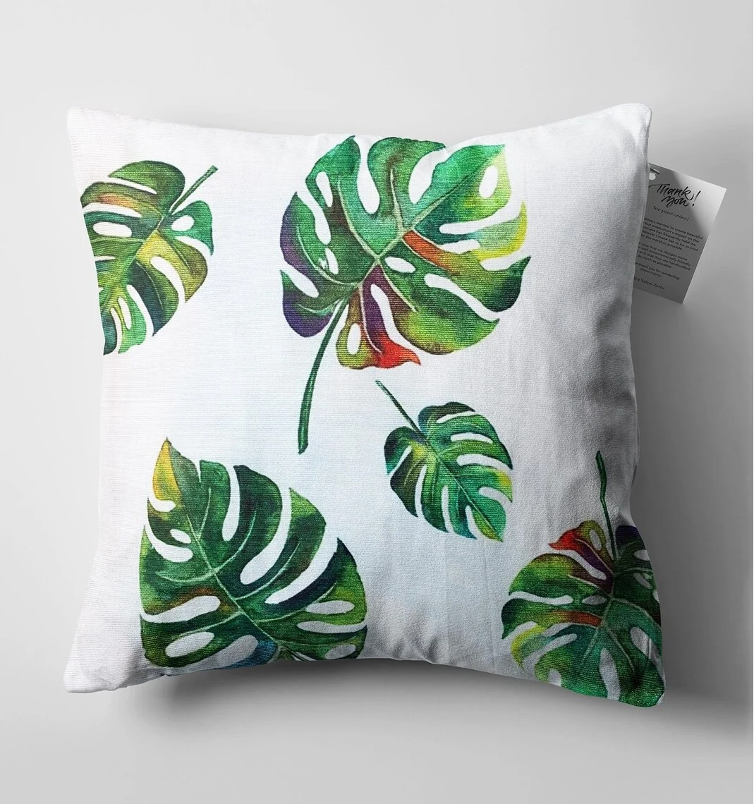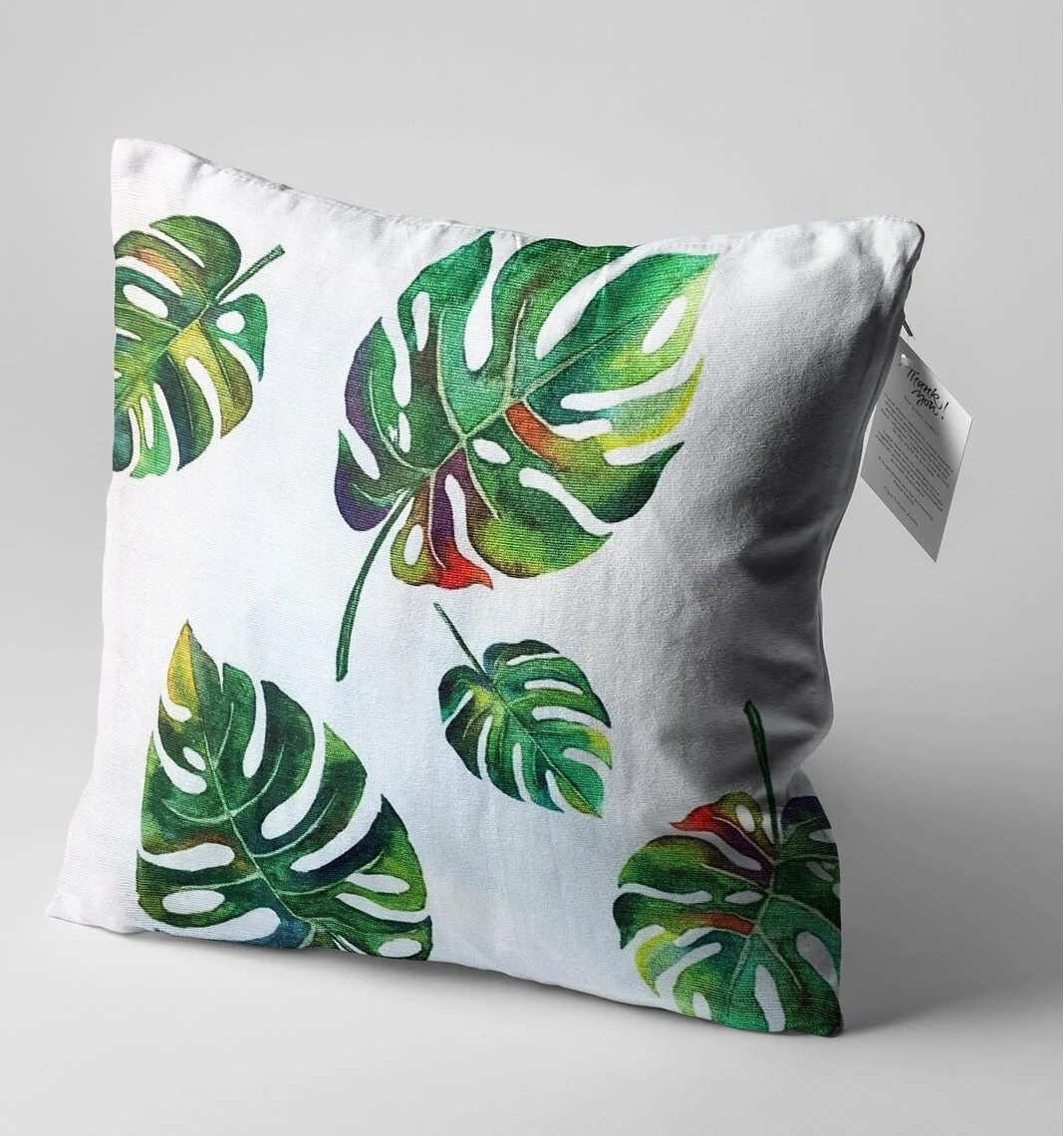 Description: This decorative throw pillow cover features a pattern of Monstera leaves, bringing a fresh, tropical, and nature-inspired feel. The leaves are painted in a watercolor style, with various shades of green, creating a vibrant and artistic look. It's a perfect accent piece to add a relaxing and energetic touch to your living space.